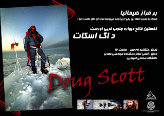 جناب آقاي دوگ اسكات كوه نورد نام آشنا و پر آوازه انگليسي كه به عنوان ميهمان افتخاري اجلاس كوه نوردي در كشورمان به سر مي برد . طي برنامه ايي ويژه از هيماليا و صعودهايش با تصاوير و فيلم هاي گرفته شده خواهد گفت .